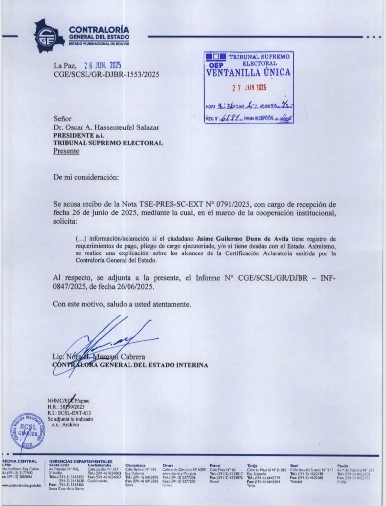 La Contraloría General del Estado informó al Tribunal Supremo Electoral (TSE), al presidente a.i. Óscar Hassenteufel, sobre la situación financiera de Jaime Dunn, en respuesta a una solicitud institucional enviada el 26 de junio de 2025. La comunicación, firmada por la contralora general interina, Lic. Nora Mamani Cabrera, incluyó el Informe N° CGE/SCSL/GR/DJBR 0847/2025, que contiene una certificación y su aclaratoria según la normativa vigente.